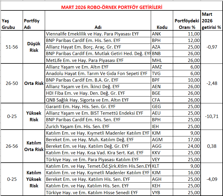 Riskolog işbirliği ile hazırlanan farklı risk seviyesinde 5 portföyümüz var. Bunlardan 3’ü faizli, ikisi faizsiz. Mart ayında bu portföylerden sadece katılım düşük riskli portföyde getiri var. Diğer portföylerin tamamı zararda.
